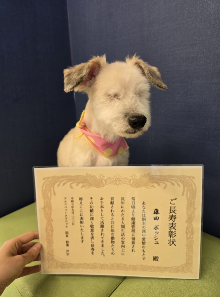 ご長寿おめでとう〜🎉✨長い時間をご家族と一緒に過ごしてきたからこその、やさしい空気感が伝わってきます☺️診察のたびに「今日も元気だな〜」とスタッフみんなでほっこりしています。きっと、おうちでの毎日があたたかくて居心地がいいんでしょうね🍀これからもご家族と一緒に、ゆったり穏やかに過ごしていってください!また会えるのを楽しみにしています🐾